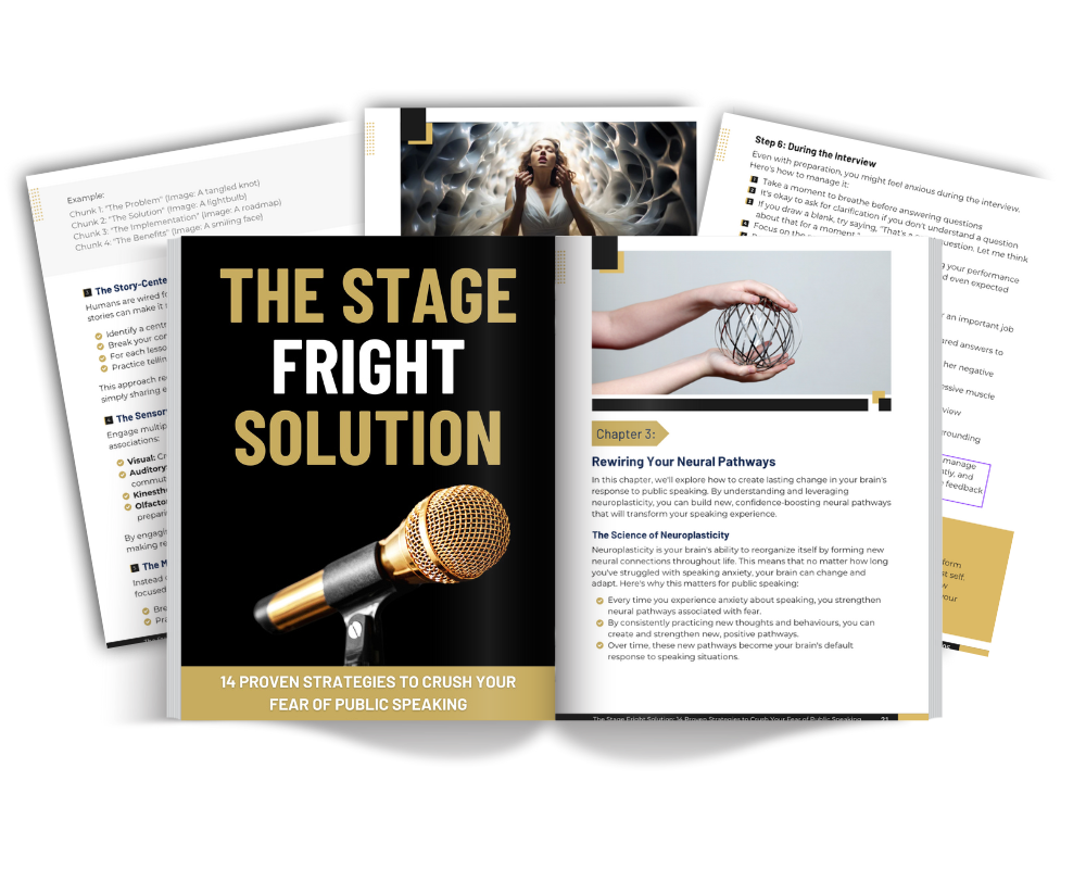 14 little-known "Neural Rewiring" techniques that reprogram your anxious brain for calm, focused delivery. (One client went from trembling mess to engaging TED speaker using just 3 of these powerful strategies!)